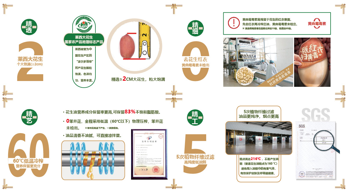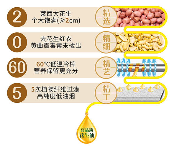 第一坊冷榨花生油采用國家發(fā)明專利“低溫冷榨”工藝,開啟花生油冷榨新時代。